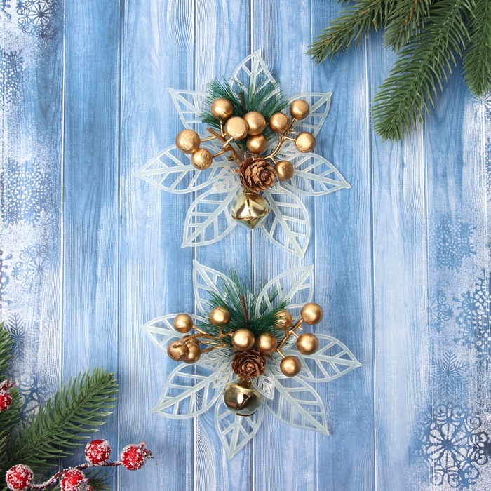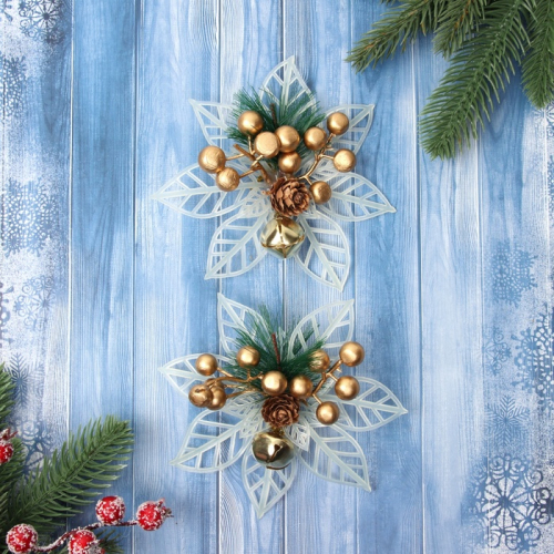 Ёлочные игрушки 2 шт. «Зимнее волшебство. Праздничные цветы» пластик, бубенчики, 13 см, белый
