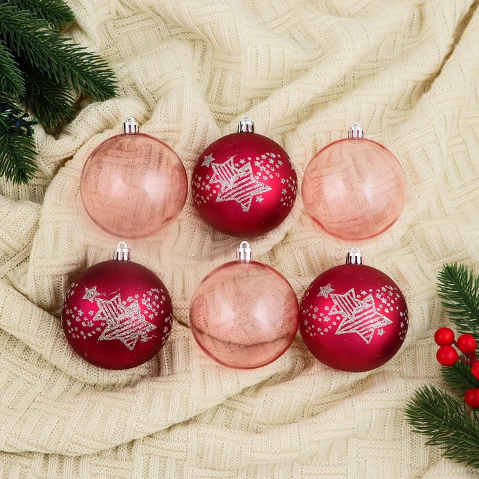 Ёлочные игрушки «Ночка», шары новогодние, d=8 см, набор 6 шт., звёзды, розовый