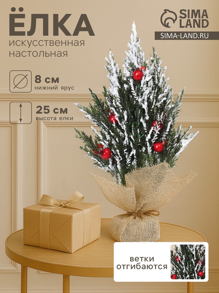 Искусственная ёлка настольная «Зимнее волшебство. Заснеженная с ягодами» в мешочке, 25 см, ветки литые отгибаются