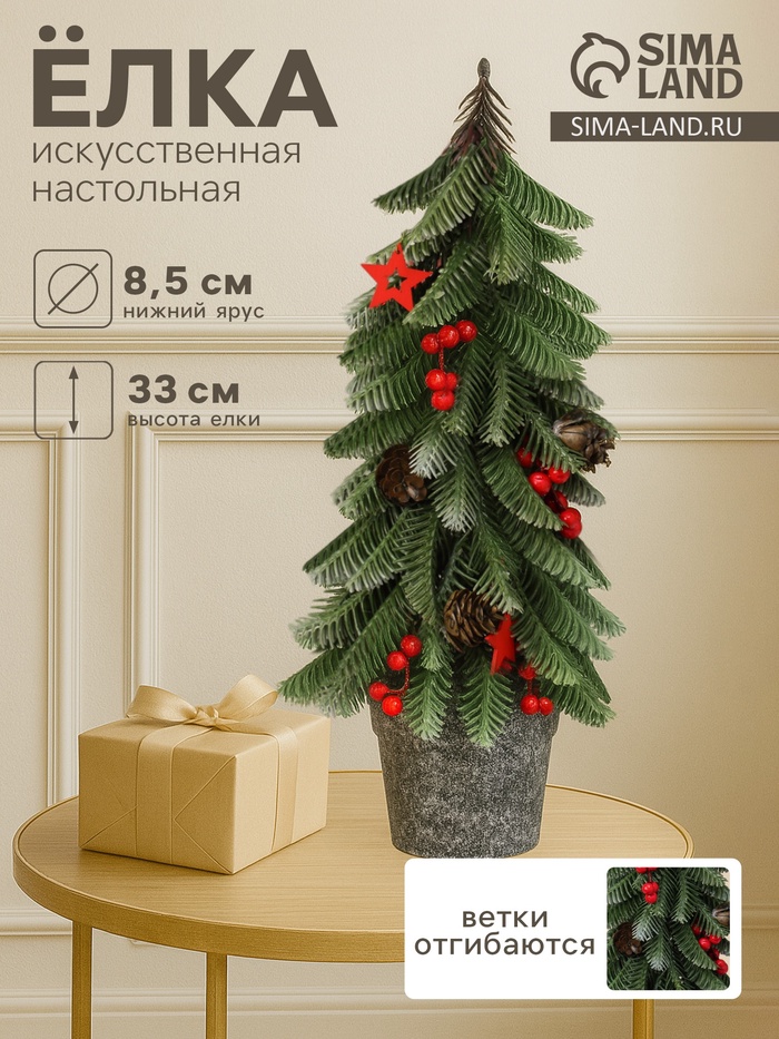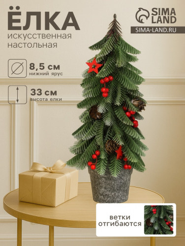 Искусственная ёлка литая настольная «Зимнее волшебство. С ягодками, в горшочке», 33×8.5 см, ветки отгибаются