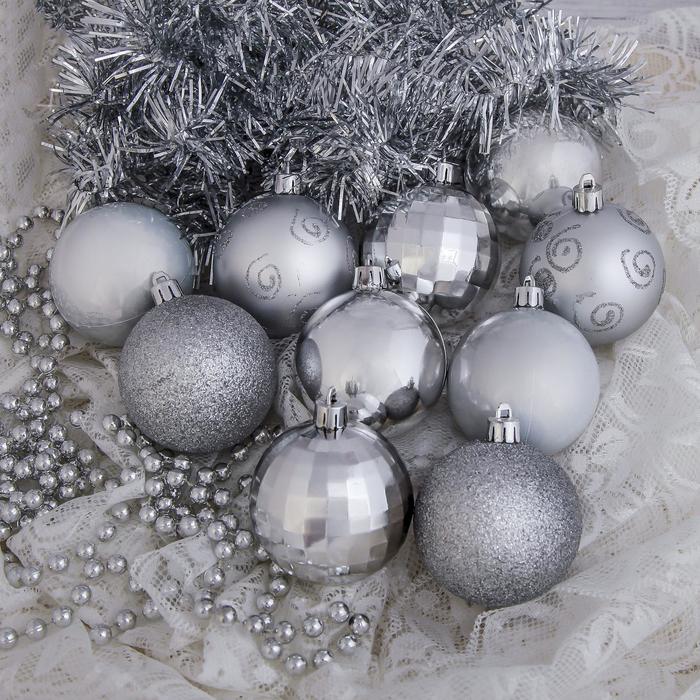 Ёлочные игрушки «Сияние», шары новогодние, набор с бусами и мишурой 12 шт., серебро