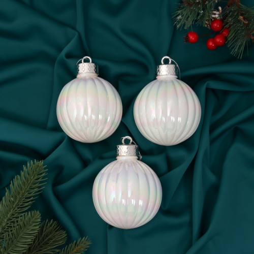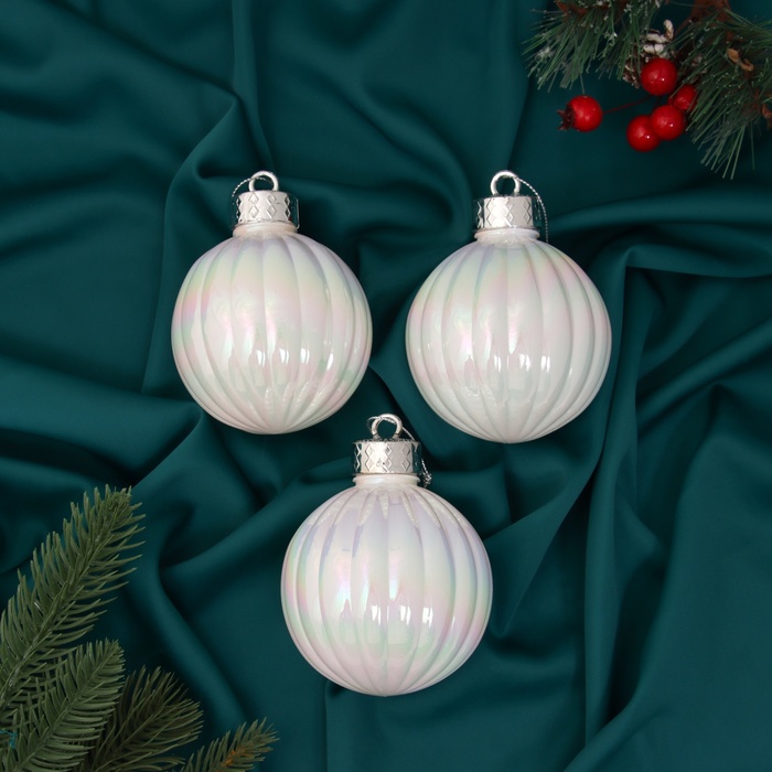 Ёлочные игрушки «Перелив», шары новогодние, набор d=8 см, 3 шт., полоски, белый перламутр