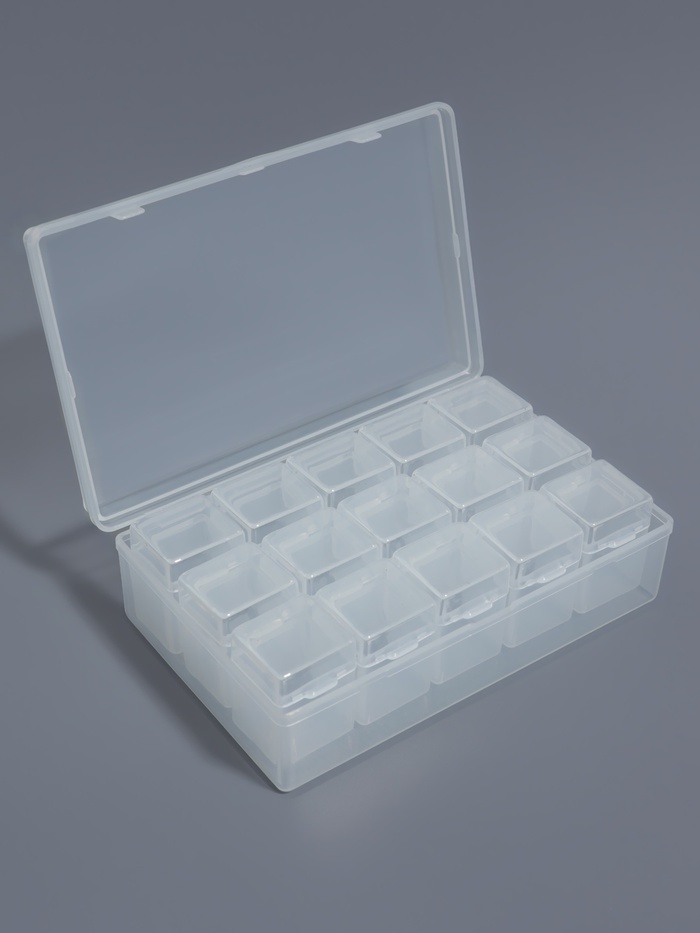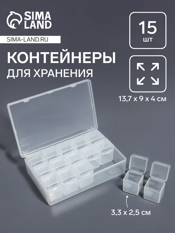 [Картинка122]Набор из 15 прозрачных баночек в контейнере от Арт Узор — практичное решение для хранения мелких предметов. Компактные размеры 13.5×8.5×3.8 см позволяют удобно разместить органайзер на рабочем столе, в шкафу или чемодане для рукоделия.