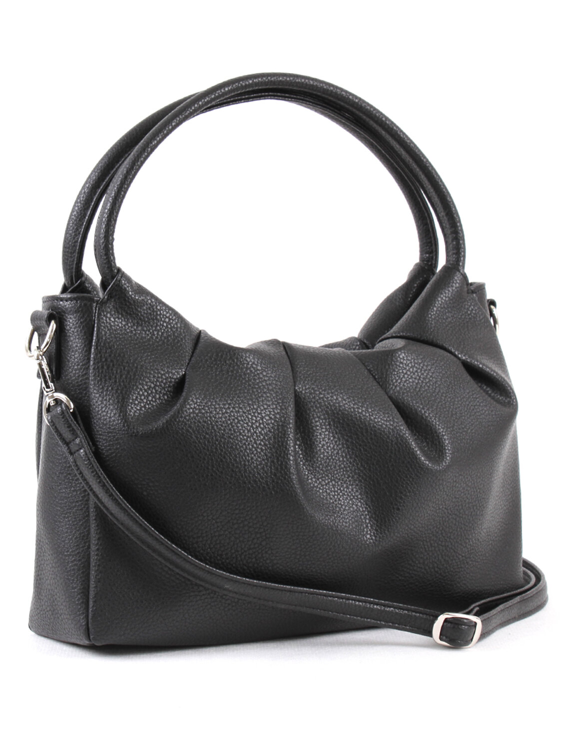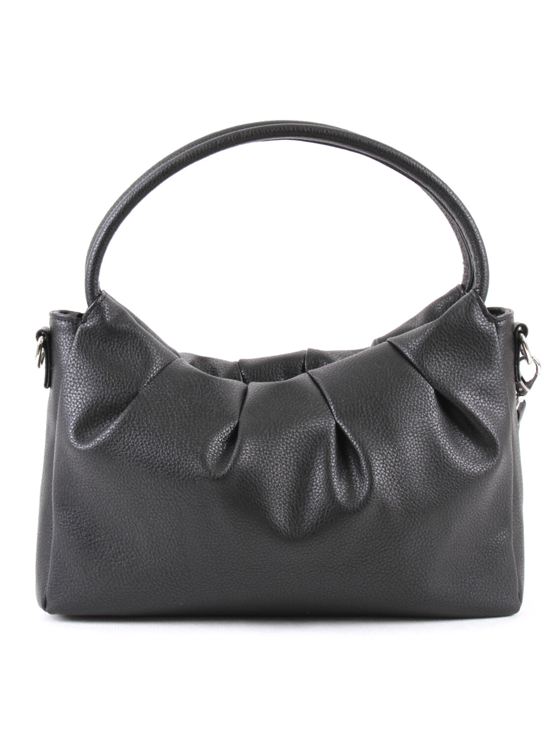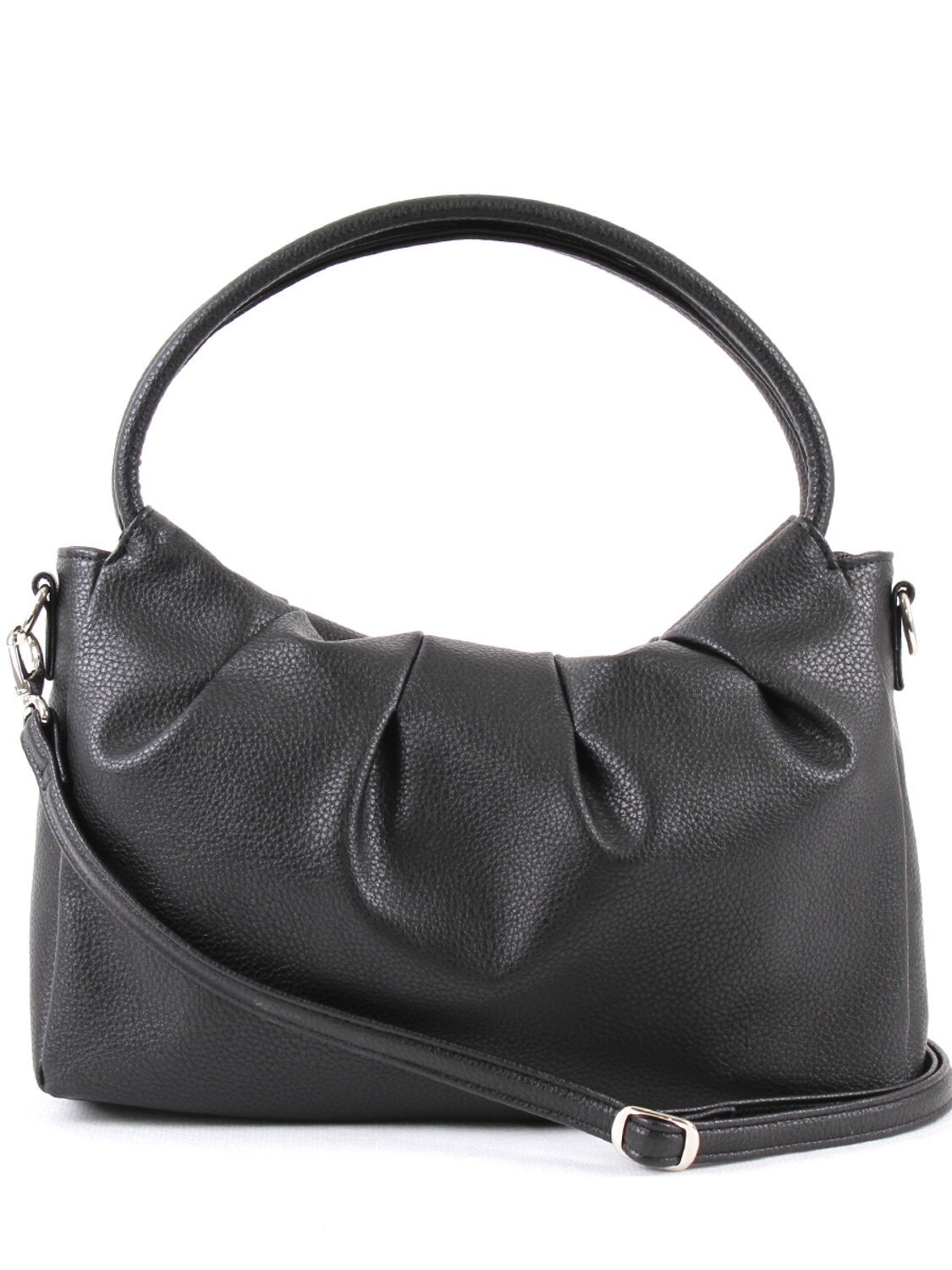 Мягкая женская сумка с одним отделением на молнии и двумя отделениями на магнитных кнопках. Декорирована складками. Внутри - два открытых кармана и карман для документов на молнии. Высота ручек - 17 см. Максимальная длина съемного ремня 140 см.