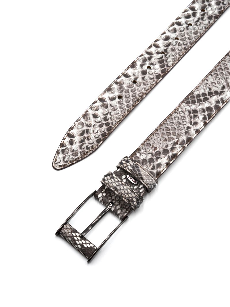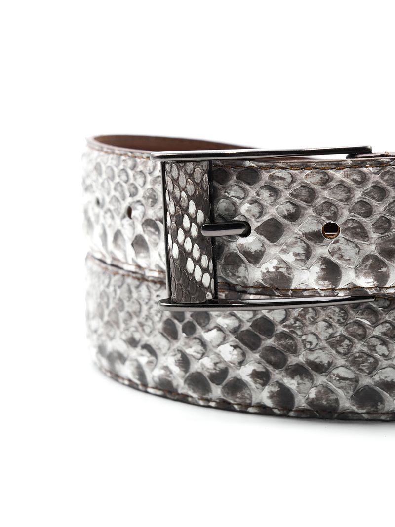 Металлическая прямоугольная пряжка декорирована лоскутом кожи питона. Пряжка фиксируется при помощи винта, что позволяет с легкостью укоротить ремень.