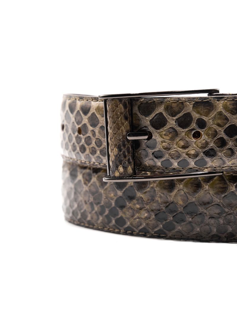 Металлическая прямоугольная пряжка декорирована лоскутом кожи питона. Пряжка фиксируется при помощи винта, что позволяет с легкостью укоротить ремень.