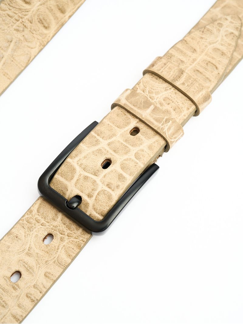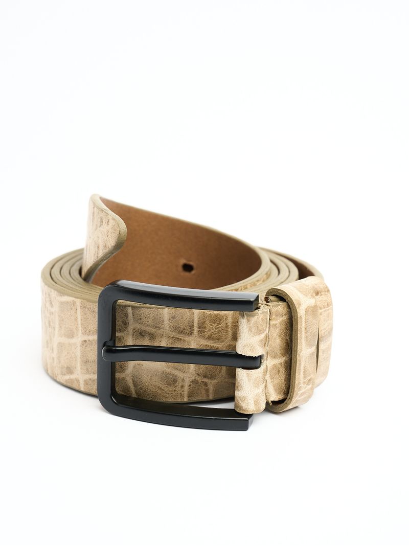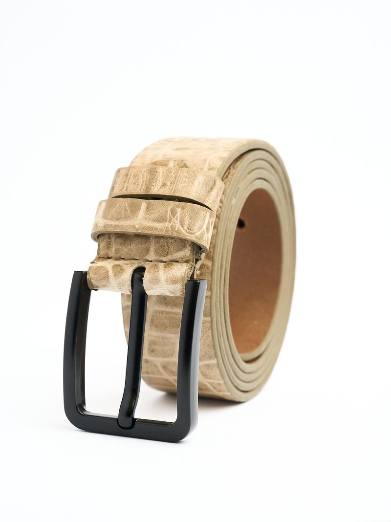 Изделие изготовлено из двух слоев, верхний слой- итальянская кожа с тиснением под крокодила, нижний- вощеный спилок. Бока ремня окрашены эластичной краской в тон цвета кожи.