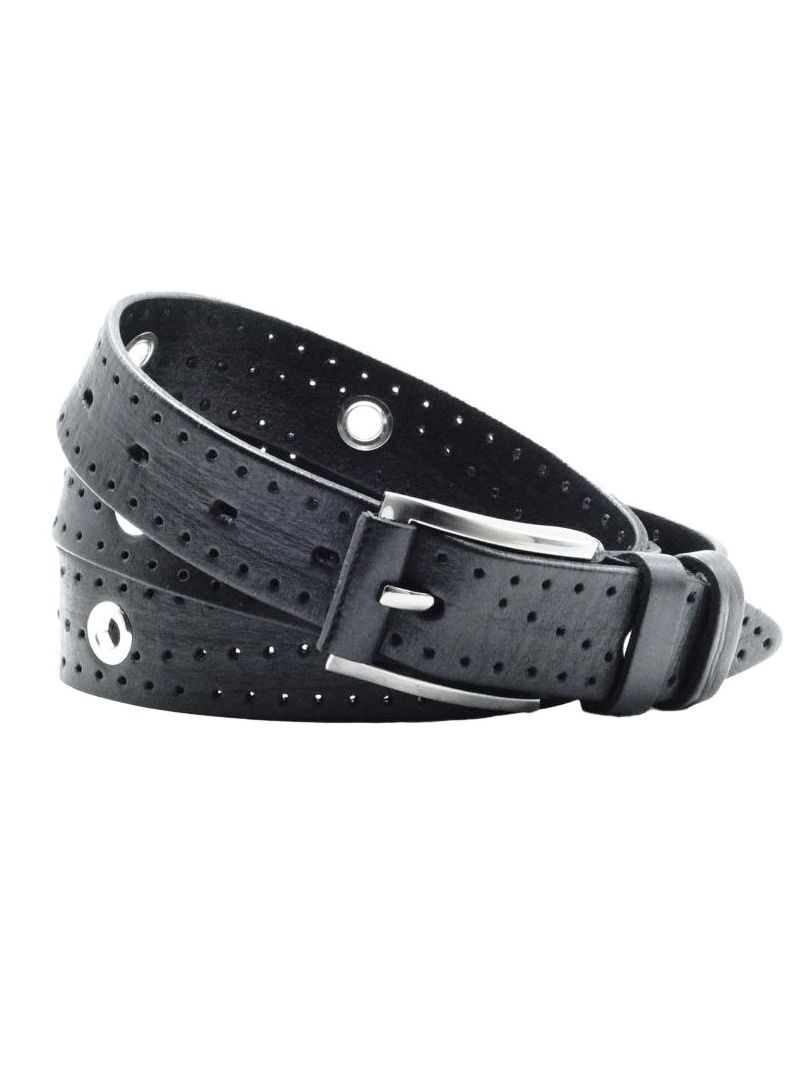 Изделие с гладкой поверхностью, полоса декорирована люверсами и перфорацией, пряжка обтянута кожей.