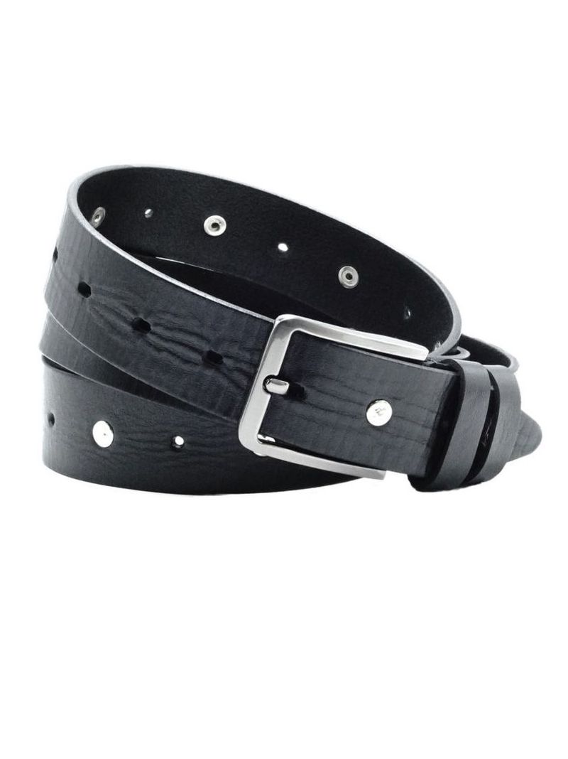 Изделие с гладкой поверхностью, полоса декорирована хольнитенами и перфорацией, пряжка обтянута кожей.