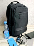 Мужской текстильный рюкзак с USB проводом. Снаружи, на лицевой стенке два кармана на молнии. Рюкзак закрывается на молнию, внутри боковой кармашек на молнии и провод USB. Снаружи, на задней стенке карман на молнии. Лямки рюкзака отстегиваются и регулируются по длине.