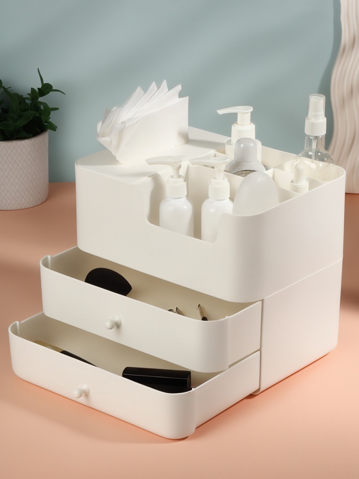 * Удобство хранения: два ящика и шесть секций позволяют эффективно организовать все необходимые предметы – от косметики до канцелярских принадлежностей.