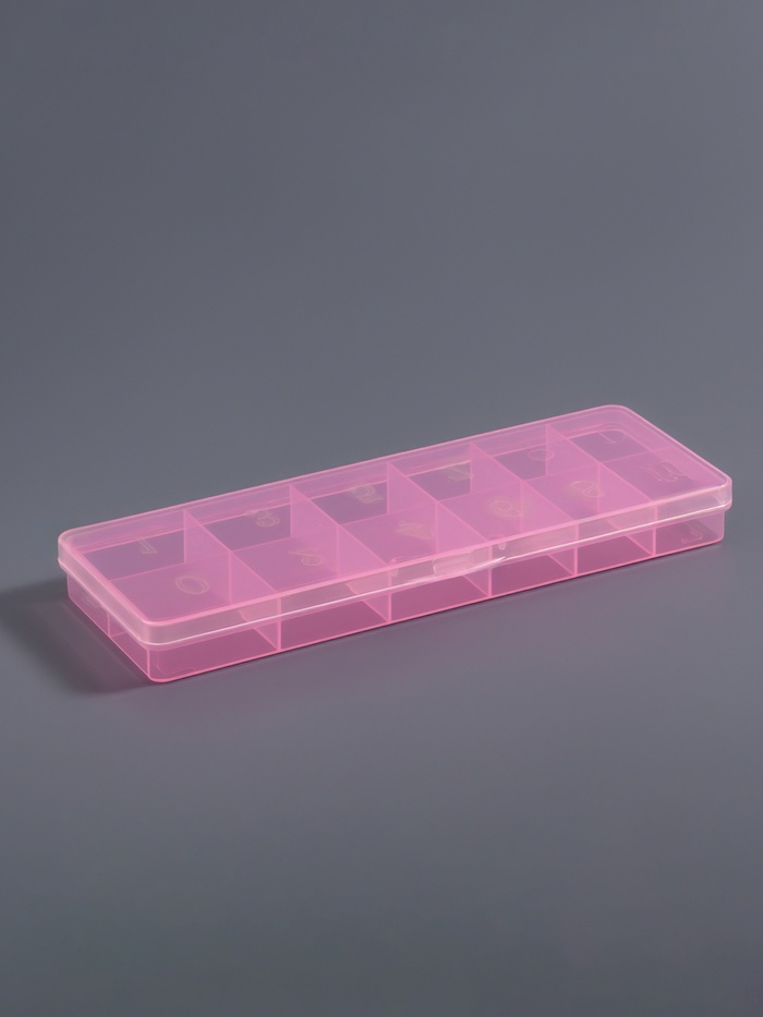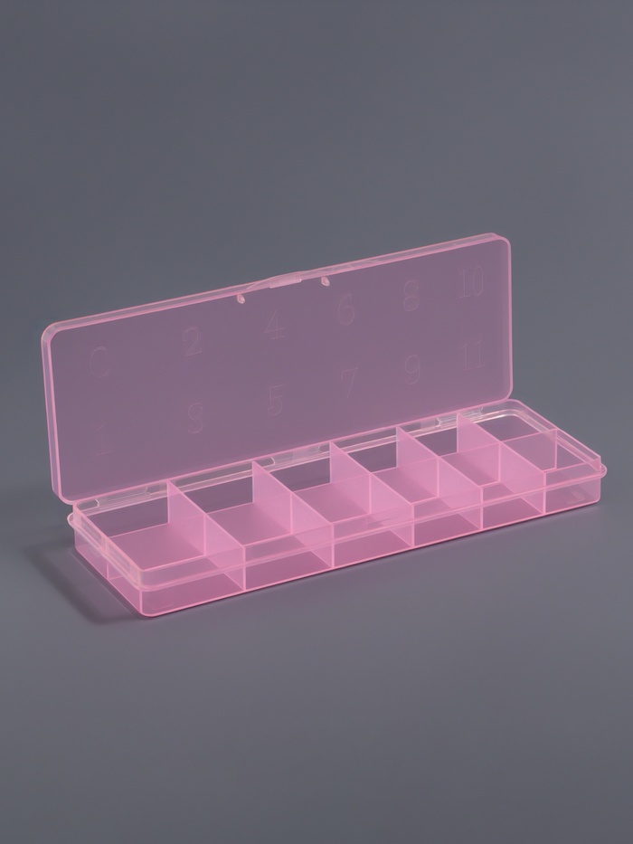 Органайзер выполнен из прочного прозрачного пластика с розовыми акцентами и имеет 12 секций, каждая из которых закрывается надежной крышкой. Это позволяет хранить декоративные элементы в идеальном состоянии, защищая их от пыли и повреждений.