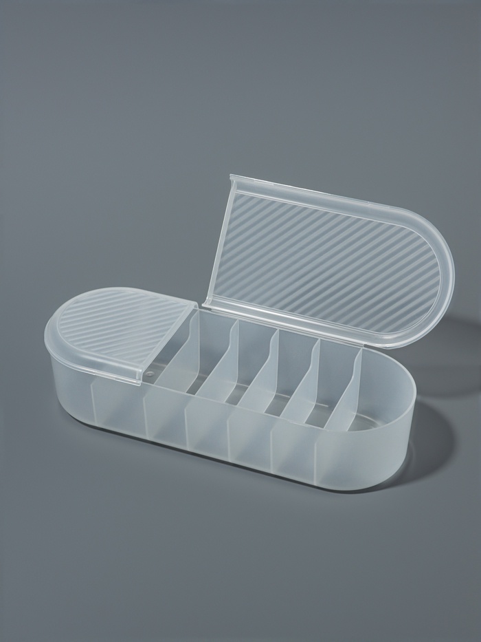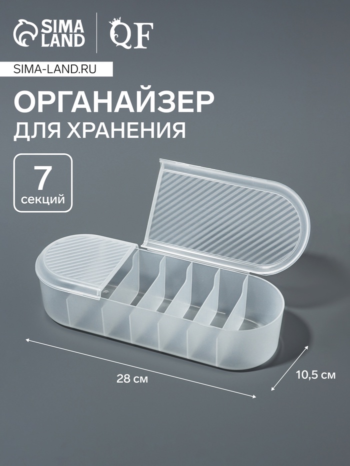 [Картинка122]Органайзер с крышкой от QF — это незаменимый помощник для вашего дома. Прозрачный дизайн позволяет легко видеть содержимое, а семь отдельных секций обеспечивают удобное хранение мелочей. Изготовленный из качественного пластика, он защищает ваши вещи от пыли, грязи и влаги, сохраняя их в чистоте и порядке.