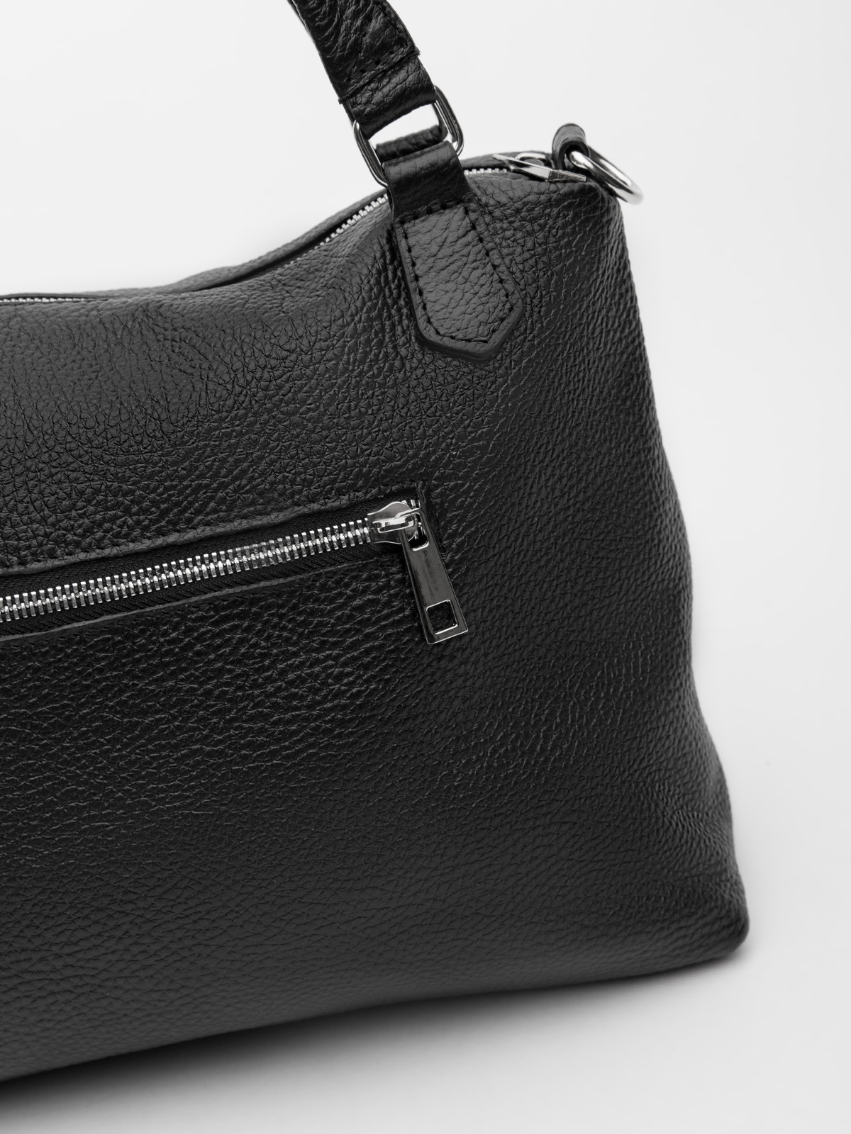 Элегантная женская сумка-тоут среднего размера из натуральной кожи с двумя удобными ручками для комфортного ношения. Регулируемый ремень с пряжкой позволяет менять длину и носить её на плече или в руках. Внутри просторное основное отделение со стандартными карманами и дополнительный накладной карман на молнии для мелочей. На передней части сумки стильное тиснение по низу, придающее модели изысканный акцент. Идеальный выбор для повседневного образа, сочетающий практичность и классический дизайн.