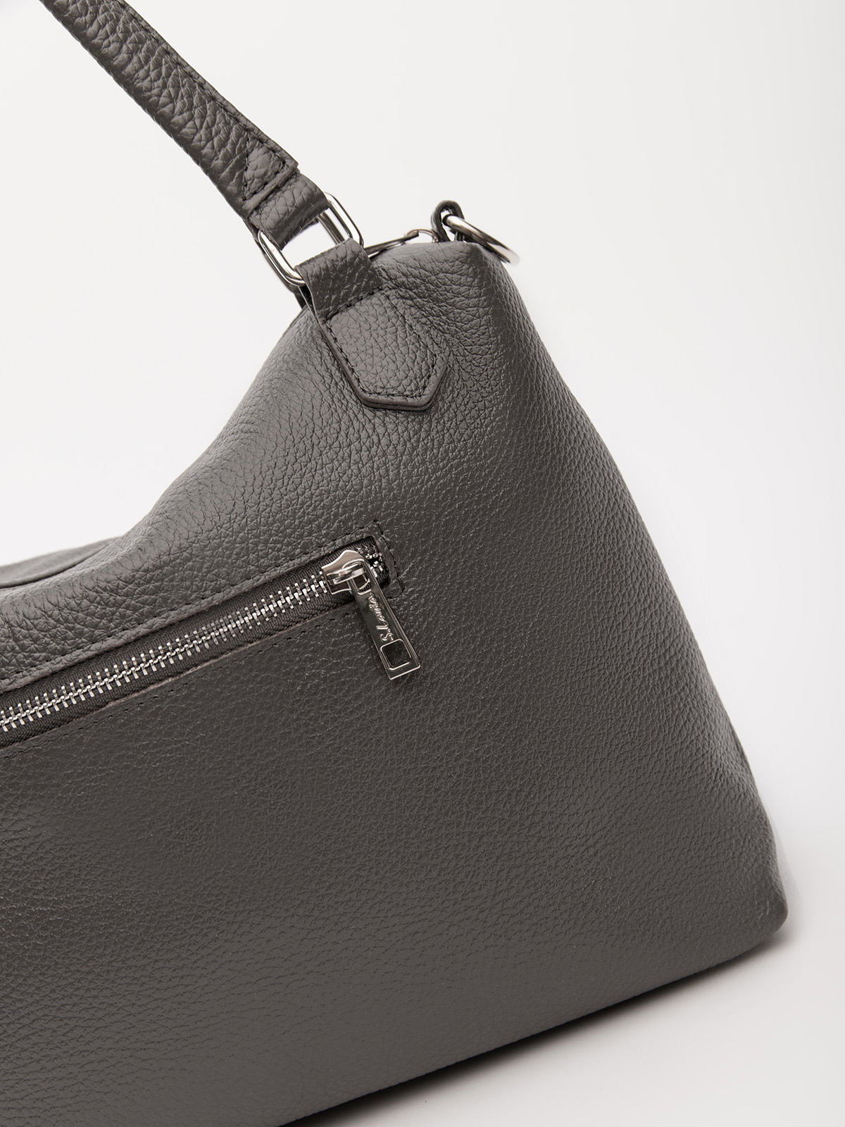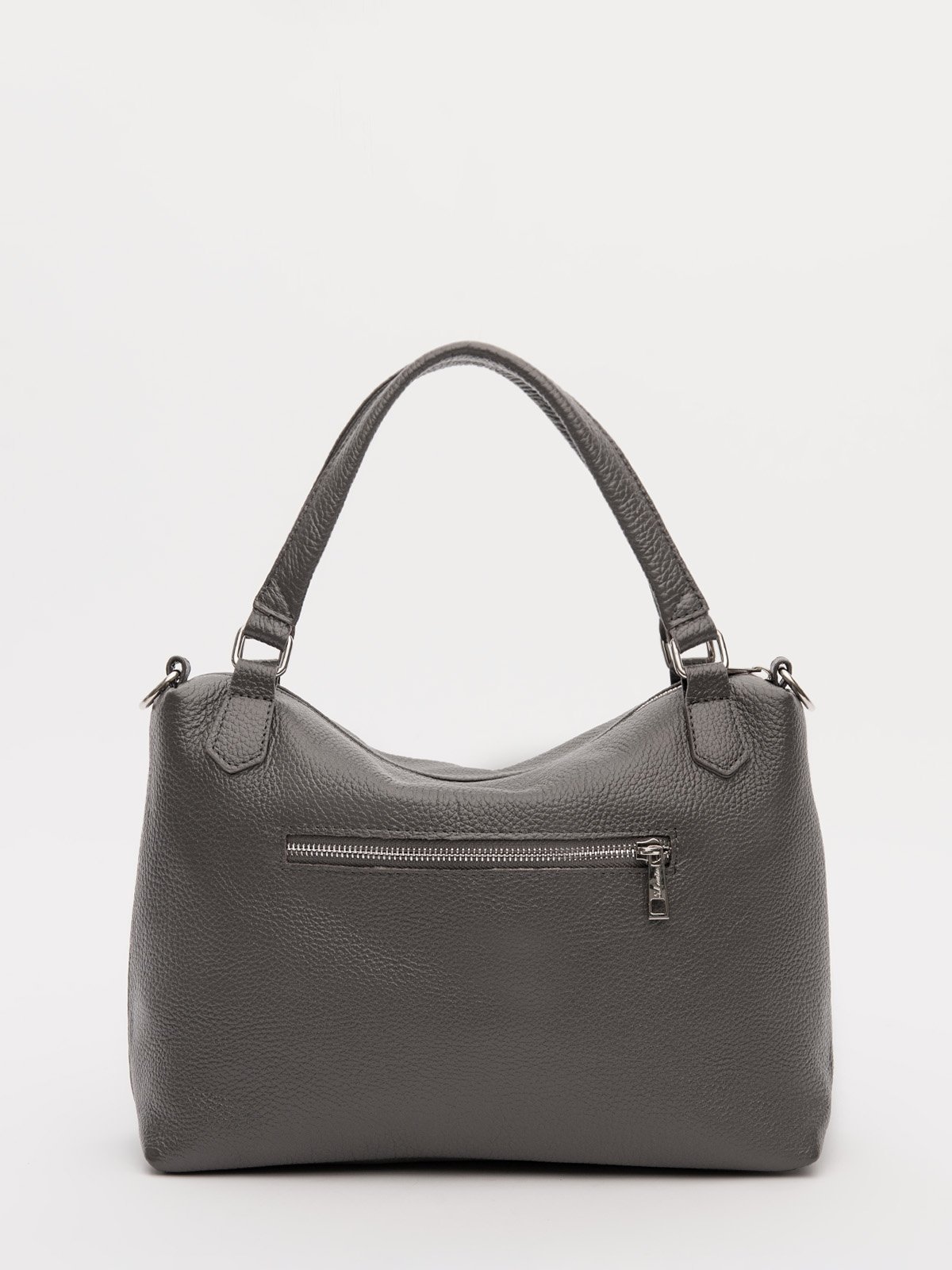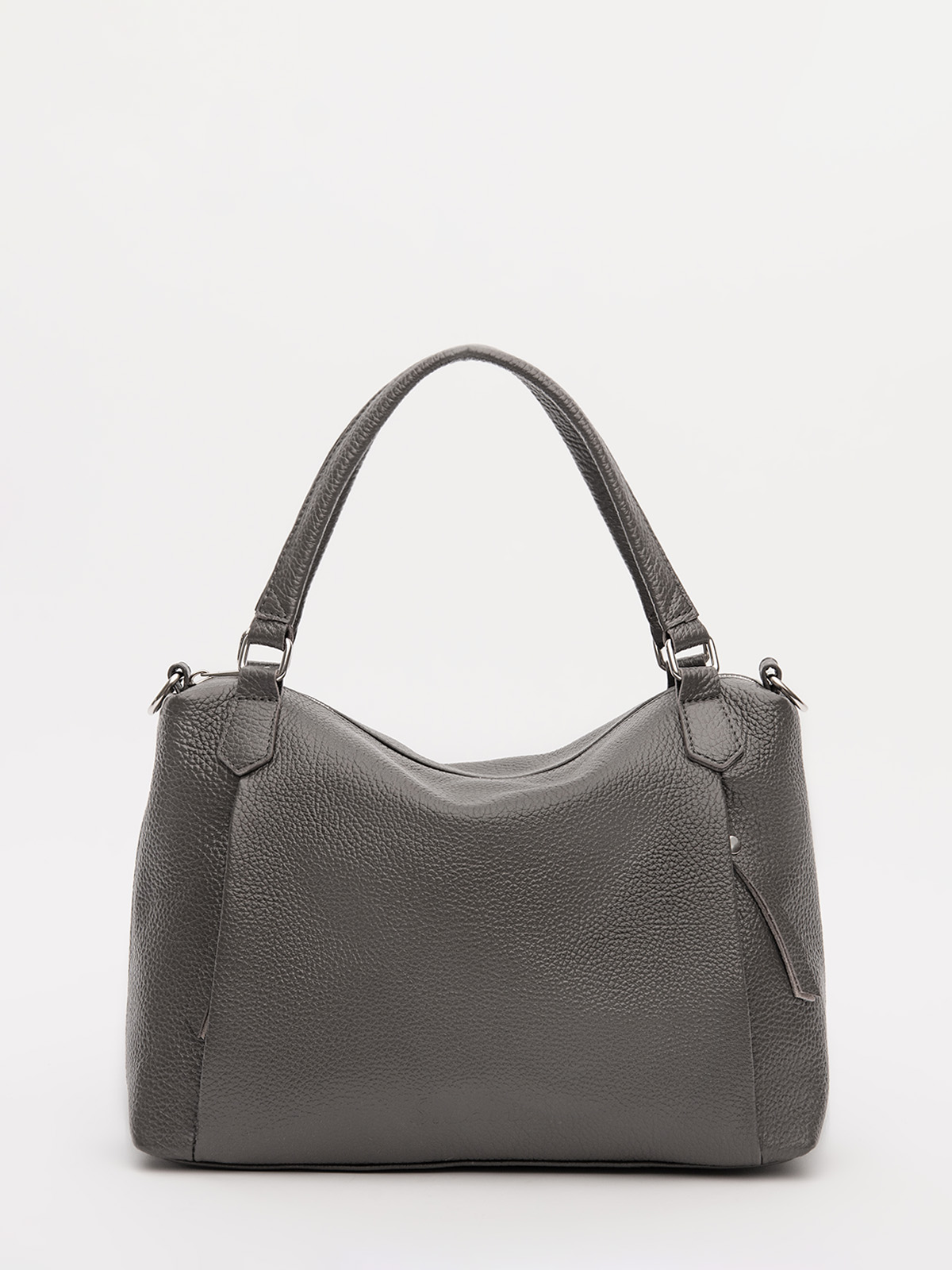 Элегантная женская сумка-тоут среднего размера из натуральной кожи с двумя удобными ручками для комфортного ношения. Регулируемый ремень с пряжкой позволяет менять длину и носить её на плече или в руках. Внутри просторное основное отделение со стандартными карманами и дополнительный накладной карман на молнии для мелочей. На передней части сумки стильное тиснение по низу, придающее модели изысканный акцент. Идеальный выбор для повседневного образа, сочетающий практичность и классический дизайн.
