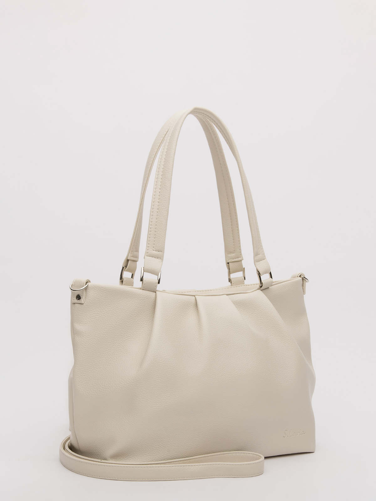 Трендовый силуэт вытянутого прямоугольника со стильными складками создаёт дополнительный объём и добавляет образу лёгкую женственность. Удобные ручки средней длины и съёмный ремень предлагают варианты ношения — от классического до более свободного. Литой декор и брендированная фурнитура подчёркивают статусность аксессуара.
