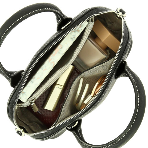 Внутри: одно большое отделение с кармашками на боковых стенках для документов, телефона и мелочей: два открытых и два на молнии. В комплекте удлинённый, регулируемый по высоте, наплечный ремень. На дне сумки имеются металлические ножки, предохраняющие от потёртостей. Модель прекрасно держит форму. Сумка закрывается на встречную молнию.