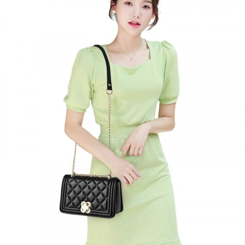 Внутри: одно отделение, по бокам которого расположены карманы на молнии и без для документов, телефона и мелочей. Сумка закрывается на молнию и крышку-клапан с замочком. В комплекте удобный ремень-цепочка, который можно использовать и в качестве ручки. Этот ремень позволяет носить сумку в руке, на локтевом сгибе и на плече.