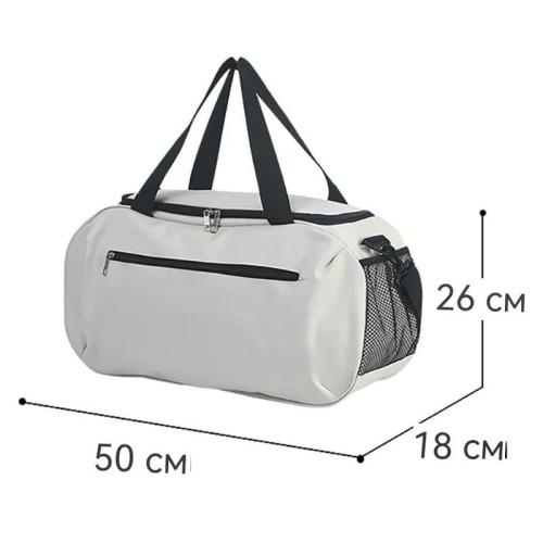 Внутри: одно большое отделение. Сумка закрывается на встречную молнию. На внешней передней стороне сумки есть карман на молнии. На боковой части сумки расположен карман сетка для бутылки с водой или зонта. В комплекте широкий удлинённый отстёгиваемый ремень, регулируемый по высоте. Сумка очень вместительная.