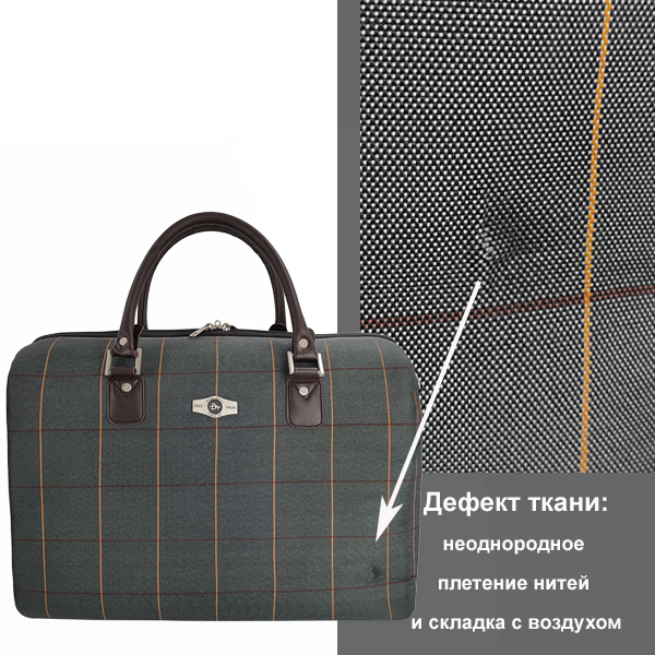 - На передней стенке бьютика есть дефект ткани в виде неравномерного плетения нитей и складки с воздушным пузырем. Складка образована в процессе прессования ткани на подложку EVA.