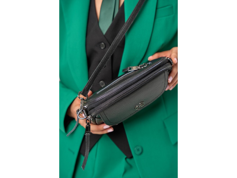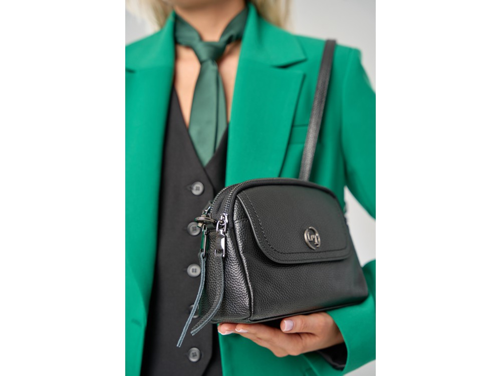 Сумка кросс-боди. В комплекте кожаный ремень с возможностью регулировки. Два основных отделения. Внутри: два кармана для аксессуаров, один из которых застегивается на молнию. Снаружи: спереди вместительный отдел под клапаном на магнитной клепке. Сзади: карман для мелочей на молнии.