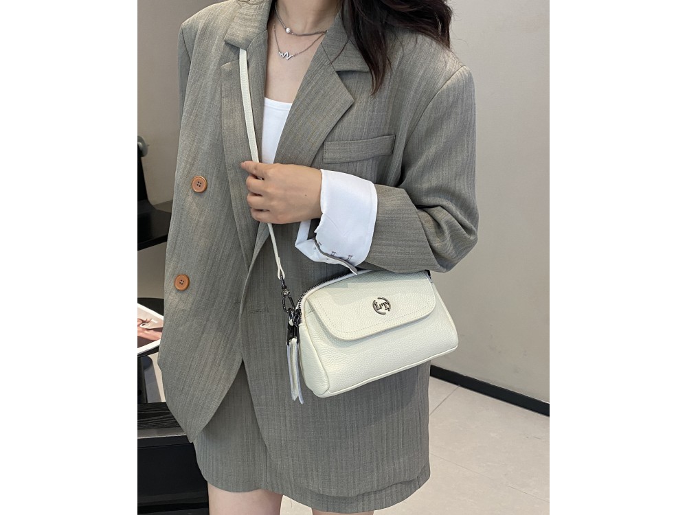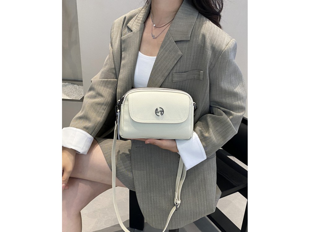 Сумка кросс-боди. В комплекте кожаный ремень с возможностью регулировки. Два основных отделения. Внутри: два кармана для аксессуаров, один из которых застегивается на молнию. Снаружи: спереди вместительный отдел под клапаном на магнитной клепке. Сзади: карман для мелочей на молнии.