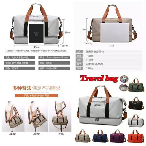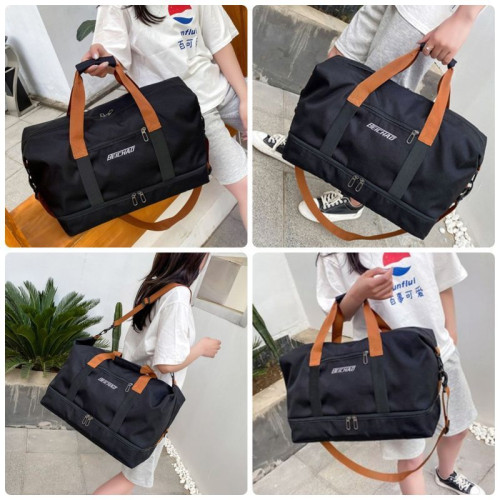 Внутри: одно большое вместительное отделение с карманами на молнии и без для телефона, документов и различных мелочей. У сумки есть отдельное водонепроницаемое отделение для влажных вещей. Сумка держит форму и закрывается на встречную молнию. Внизу у сумки есть отдельный отсек для обуви, который так же закрывается на встречную молнию. В комплекте широкий прочный ремень, регулируемый по высоте. На внешней передней части сумки расположен карман на молнии. На внешней задней стенке есть лямка для крепления сумки на тележку или туристический чемодан на колёсах. Ручки и ремень сумки позволяют носить её в руке, на запястье, на локте, на плече и через плечо.