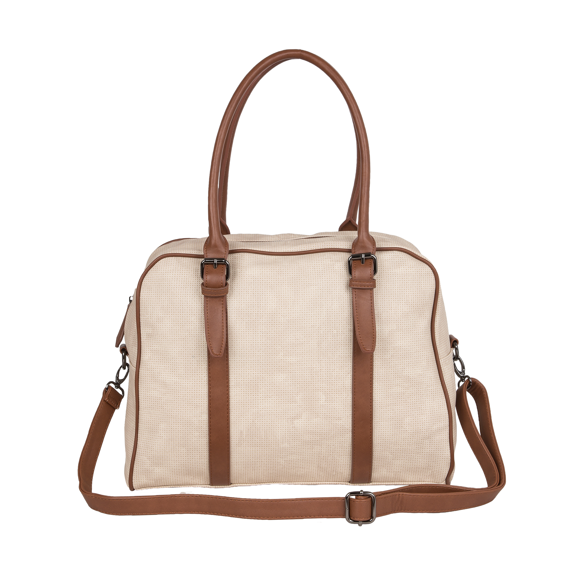 Дорожная вместительная  сумка POLA  выполнена из экокожи  и очень практична в повседневном использовании. Основное отделение закрывается на молнию, внутри основного отделения есть несколько открытых кармашков и карман на молнии. Сзади сумки есть карман на молнии. У сумки есть 2 ручки для переноски, высота которых составляет 25см  и съёмный плечевой ремень длина которого 148см.