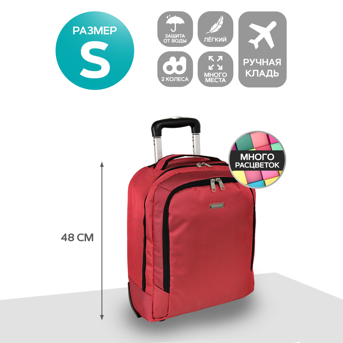Внутри одно просторное отделение с фиксирующими ремнями для вещей и удобный карман. На передней стенке чемодана есть удобный карман на молнии, внутри которого сетчатый карман для мелочей. Ручка – тележка выдвигается на 50 см, и ее также можно убрать под молнию. Также есть удобная ручка для переноски. Колеса прорезиненные, дно дополнительно защищено от истирания.