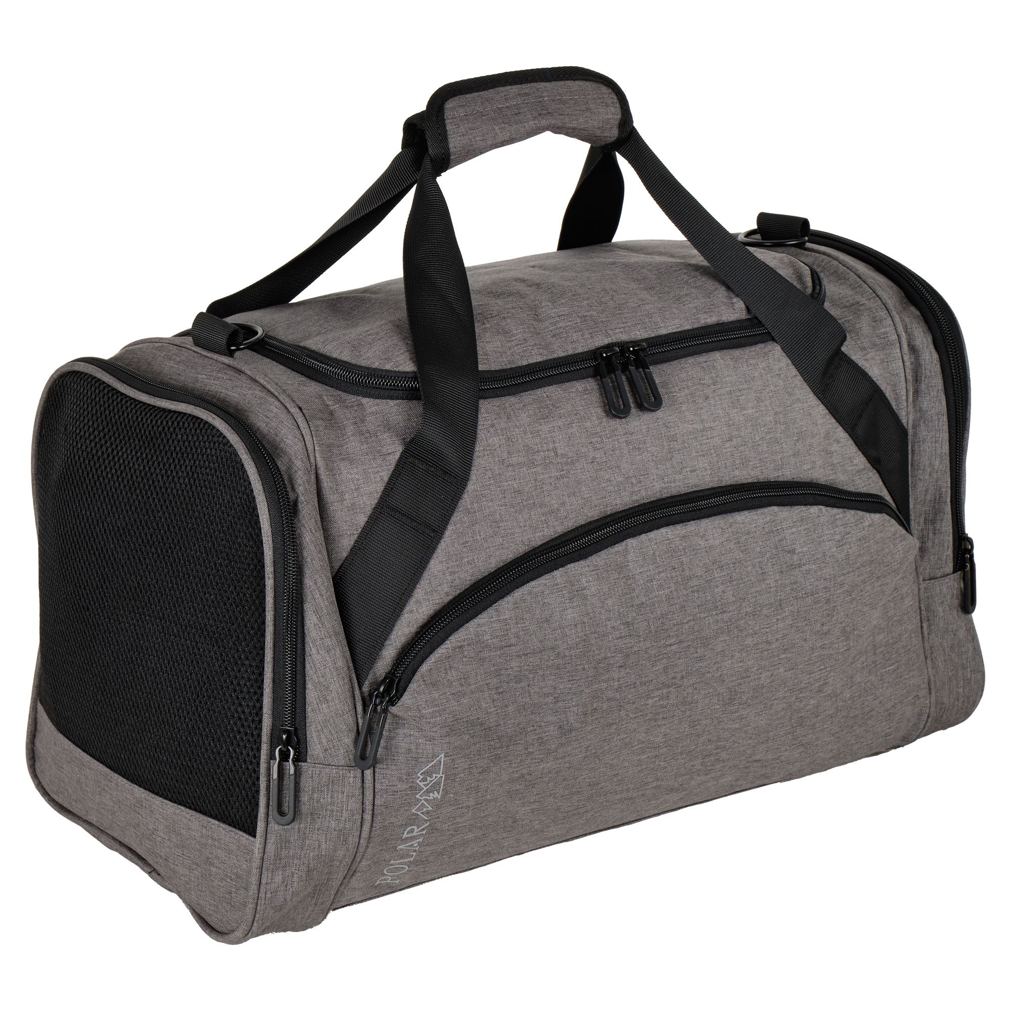 Очень легкая и удобная дорожная сумка фирмы Polar.  Состоит из одного большого вместительного отделения, внутри карман на молнии. Спереди сумки карман на молнии и два боковых, один из них сетчатый карман для обуви.  В дорожную сумку легко помещаются спортивная форма, обувь или вещи для поездки. Сумку удобно носить через плечо длина ремня 142 см. Высота ручек 17 см.   На дне сумки пластиковые ножки, чтобы дно оставалось чистым.