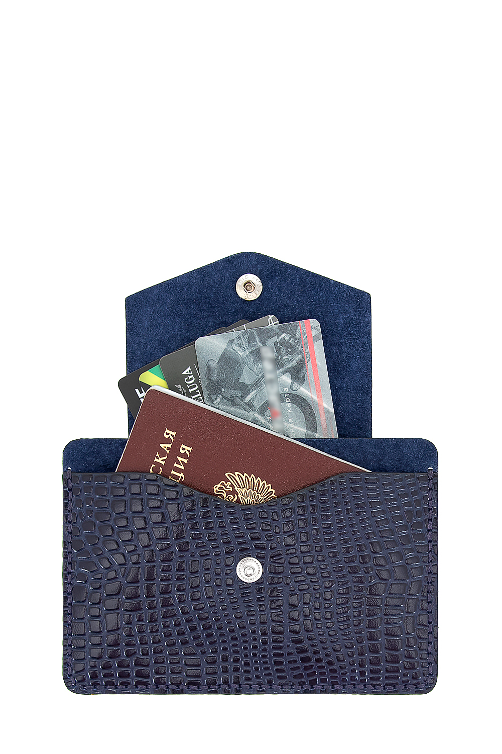 Футляр для документов. Основное отделение для паспорта и других документов подходящего формата (пенсионное свидетельство, документы на автомобиль и т.п.), предусмотрено и отделение под пластиковые карты, куда удобно положить водительские права или магнитный пропуск.