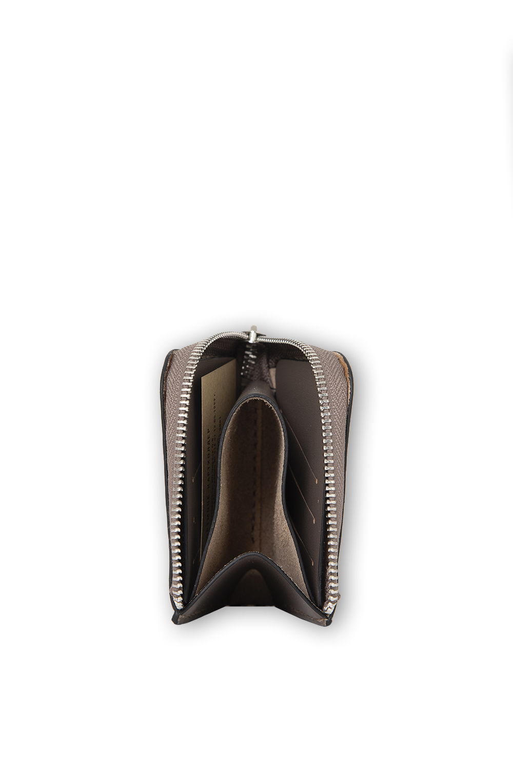 Портмоне-кардхолдер ручной работы. Прошит вощеной нитью. Застегивается на металлическую молнию, имеет внутри отделения для банковских карт, денежных купюр и мелочи. Без подкладки.