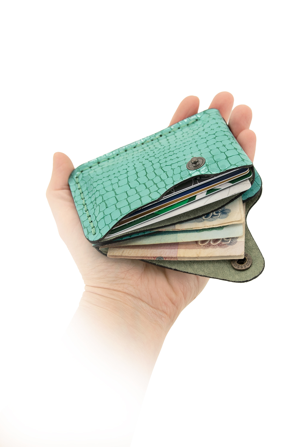 Портмоне-кардхолдер ручной работы. Прошит вощеной нитью. Застегивается на одну кнопку, имеет три отделения для банковских карт и денежных купюр. Без подкладки.