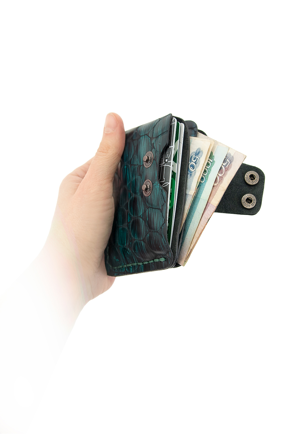 Портмоне-кардхолдер ручной работы. Прошит вощеной нитью. Застегивается на две кнопки,имеет три отделения для банковских карт и денежных купюр. Без подкладки.