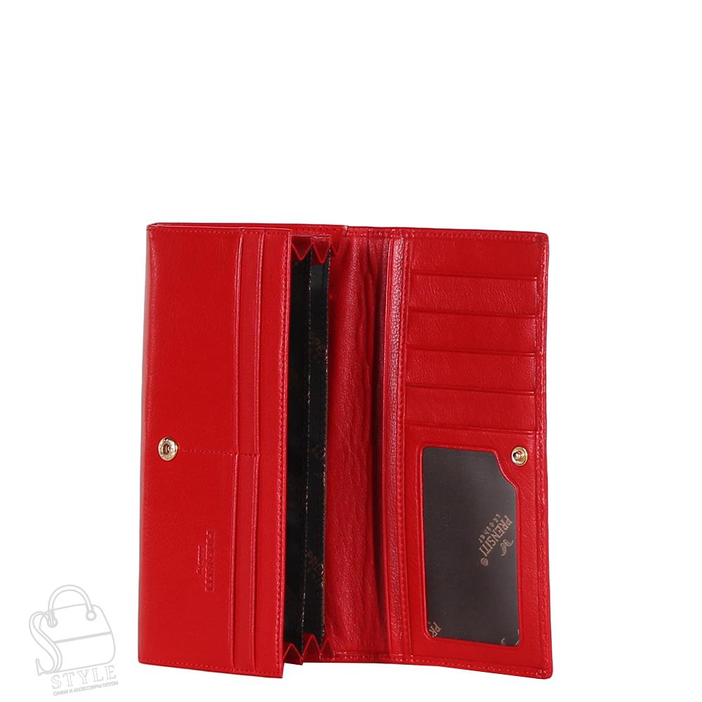 Полноразмерный кошелей с клапаном, выполнен из натальной кожи. Внутри два отдела для купюр, девять отделом для карт. Суражи карман на фермуаре. Фурнитура блестящее золото.