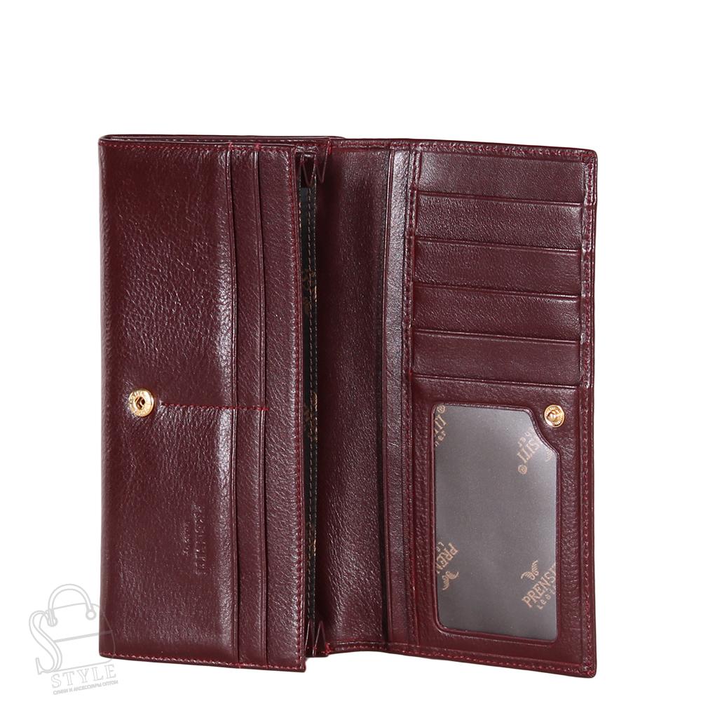 Полноразмерный кошелей с клапаном, выполнен из натальной кожи. Внутри два отдела для купюр, девять отделом для карт. Суражи карман на фермуаре. Фурнитура блестящее золото.