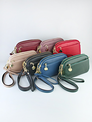 Легкая, компактная сумочка вмещает все необходимые вещи: телефон, деньги, ключи, банковские карты. Оснащена двумя застежками - молнией и фермуар, благодаря чему сумочка смотрится оригинально и необычно.