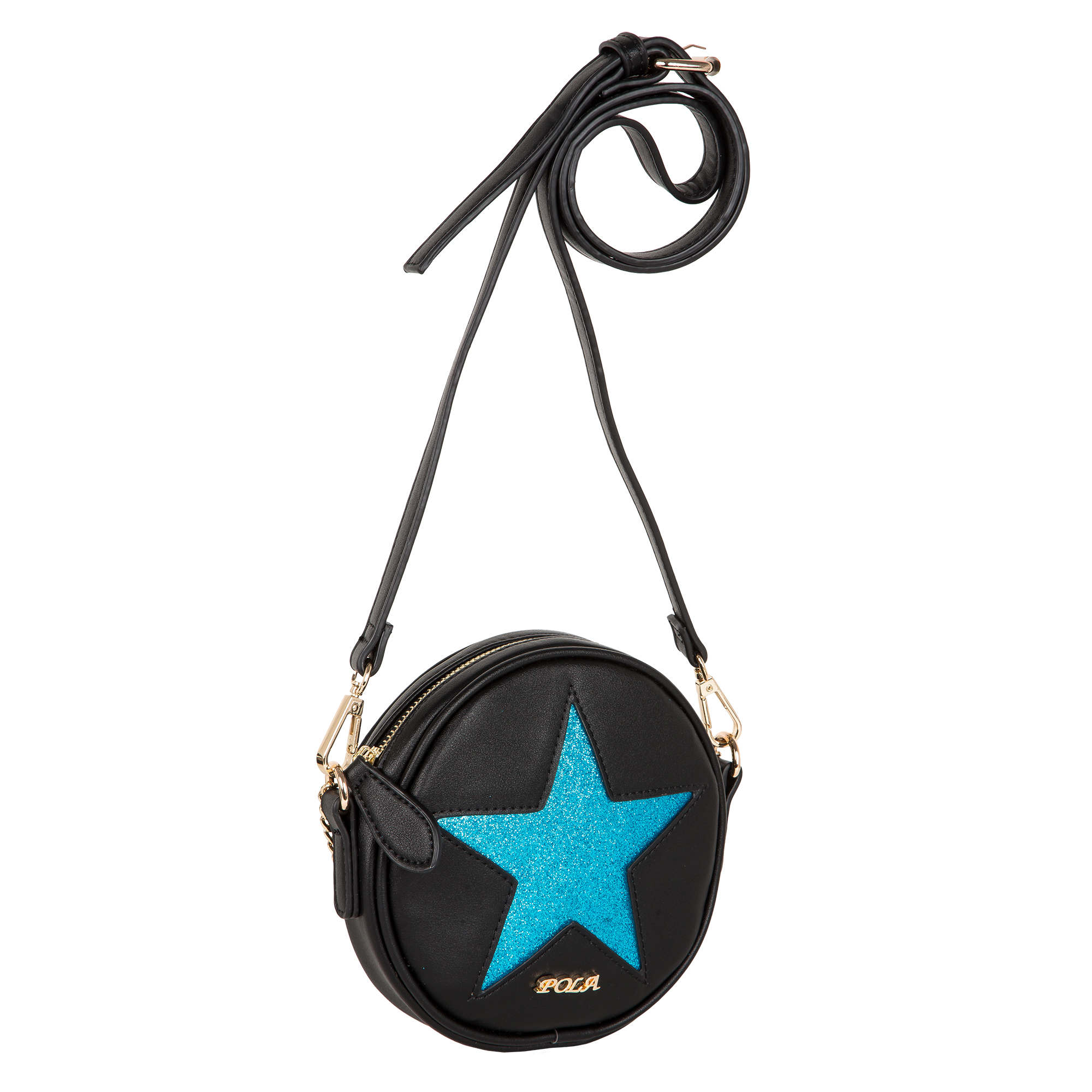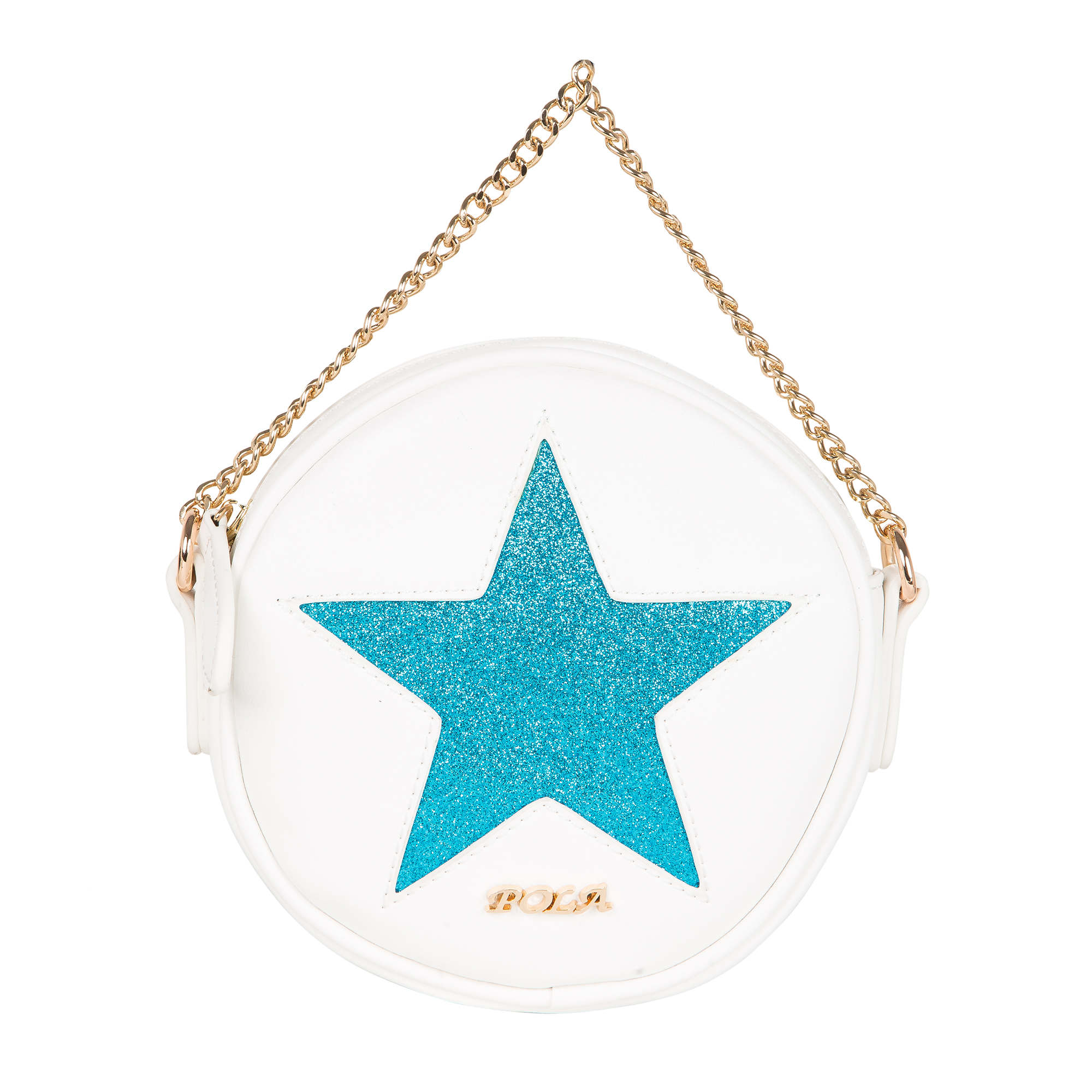 Ультрамодная, миниатюрная сумка абсолютно круглой формы Pola выполнена из экокожи и великолепно подходит как для  создания вечернего образа, так и и для повседневного использования модницами. Данная модель по центру декорирована  крупной яркой звездой различной цветовой гаммы. Сумочка закрывается на металлическую молнию. Особую изысканность данной сумке придаёт ручка- цепочка, в комплект входит съёмный регулируемый ремень, длина которого составляет 116 см. Цвет фурнитуры-золото.