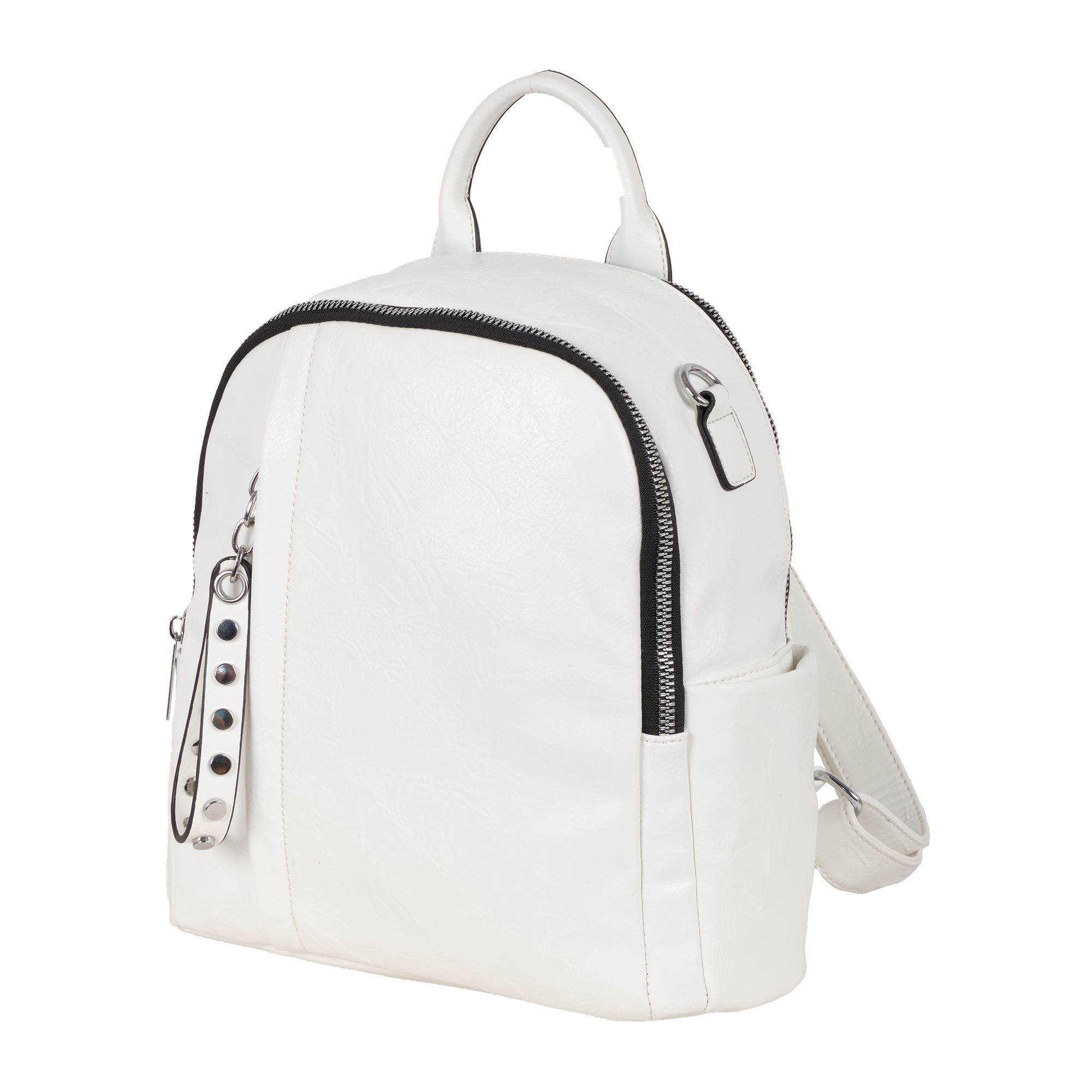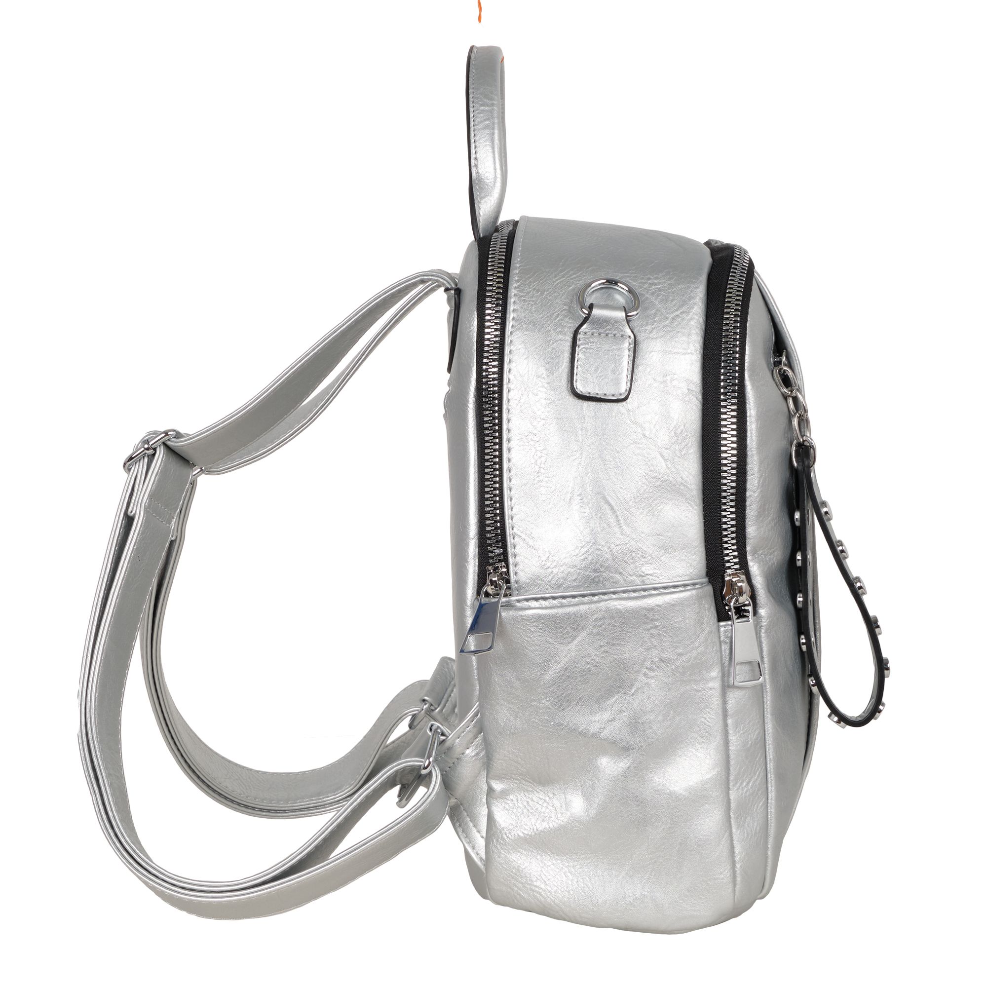 Женская сумка-рюкзак фирмы Pola выполнен из экокожи. Отлично подойдет для повседневного использования. У сумки- рюкзака два независимых отделения застегиваются на металлическую молнию. Центральный отсек для персональных вещей в ней также можно разместить документы формата А4, есть маленький карман на молнии для небольших предметов. Большой передний карман внутри с небольшим открытым карманом для мелочей. Спереди есть вертикальный  карман на молнии. Сзади также есть небольшой потайной кармашек. Два боковых кармана. У сумки-рюкзака есть съёмный ремень максимальная длина 83 см за счет него рюкзак можно носить на плече как сумку. Максимальная длина лямок рюкзака 90см. Длина ручки 9 см. Цвет фурнитуры серебро.