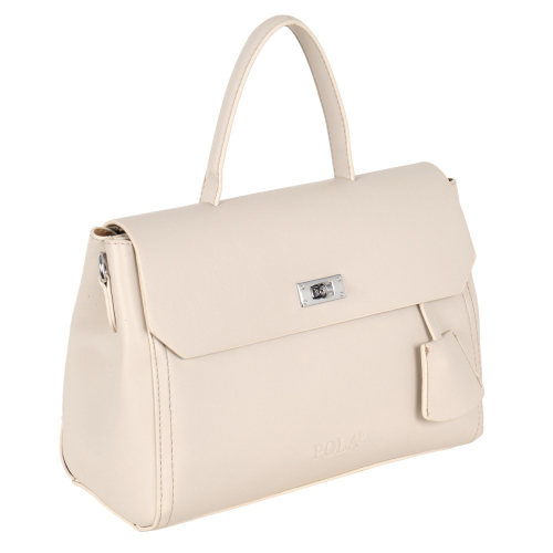 Элегантная сумка Pola выполнена из экокожи. Сумка прекрасно подойдёт женщинам, которые предпочитают деловой стиль. Сумка состоит из одного основного отделения, которое закрывается клапаном на поворотный металлический замок. Внутри основного отделения есть кармашек на молнии и один открытый карман. Сзади сумки присутствует маленький карман на молнии.  У сумки есть ручка для переноски, высота которой 9 см и два съемных ремешка, один тонкий 117 см и 77см второй ремешок шириной 3,5 см. Цвет фурнитуры-серебро.