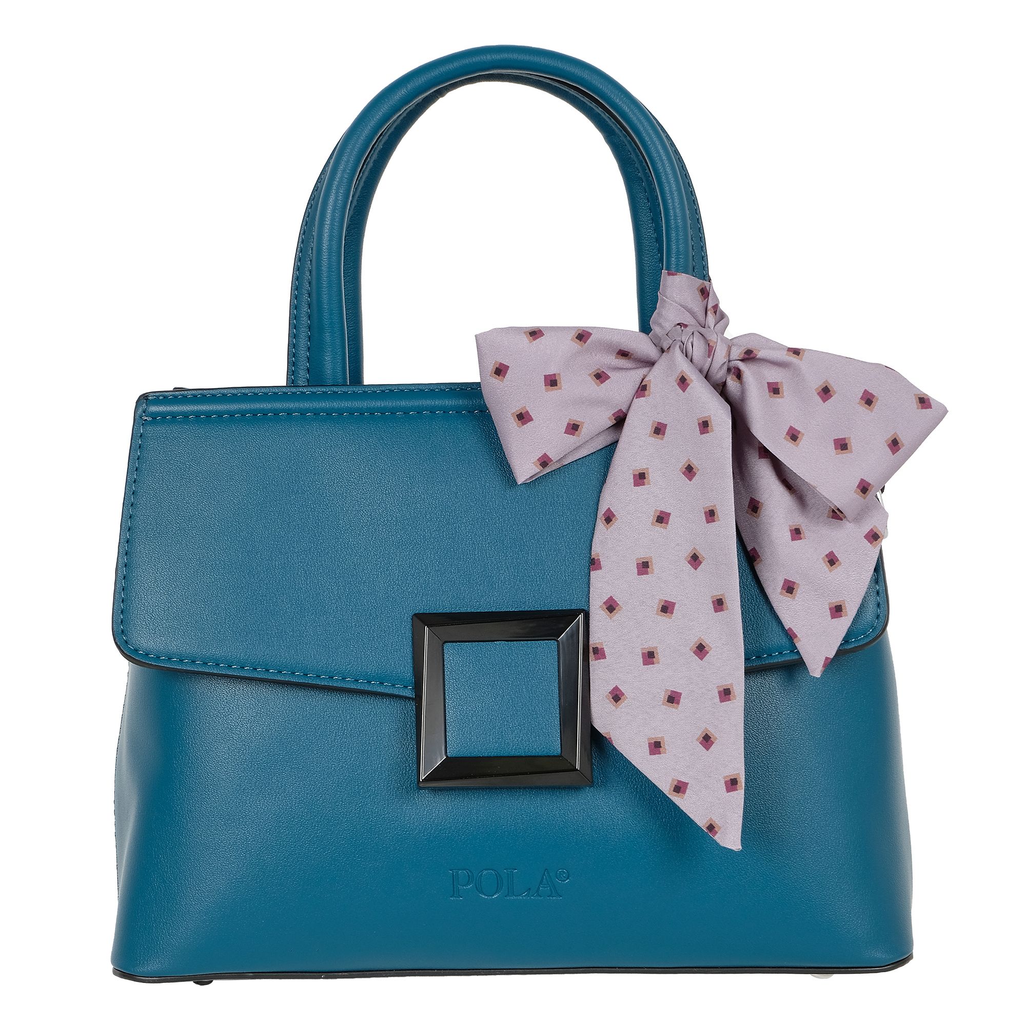 Элегантная сумка Pola выполнена из экокожи, закрывается на металлическую молнию. Украшена платком и декоративным клапаном на кнопке. Внутри основного отделения расположены два кармана на молнии и два открытых кармашка. Сзади сумки присутствует маленький карман на молнии. У сумки есть ручка для переноски, высота которой 13 см и два ремешка, один тонкий съёмный 112 см и 87 см второй ремешок шириной 3,5 см. Цвет фурнитуры-серебро.