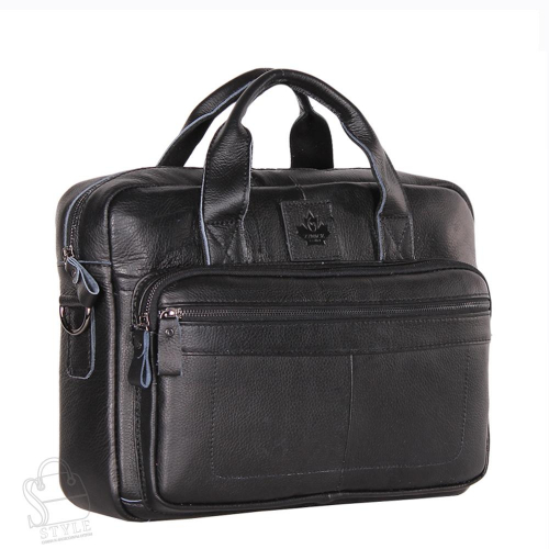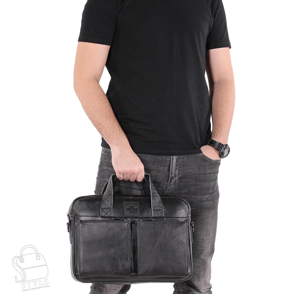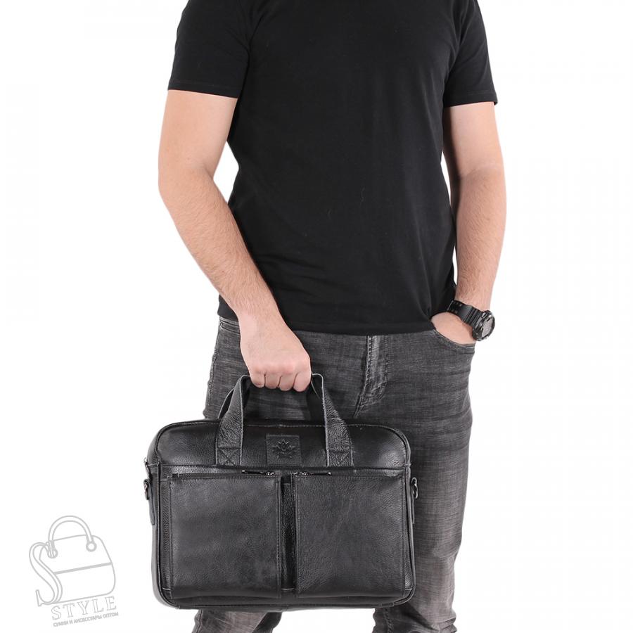 Мужской портфель выполнен из натуральной кожи. Дополнен  фурнитурой темное серебро. Данная модель закрывается на молнию. Каркас полужесткий. Носится в руке за встроенные ручки или на плече. В комплекте имеется съемный ремень.