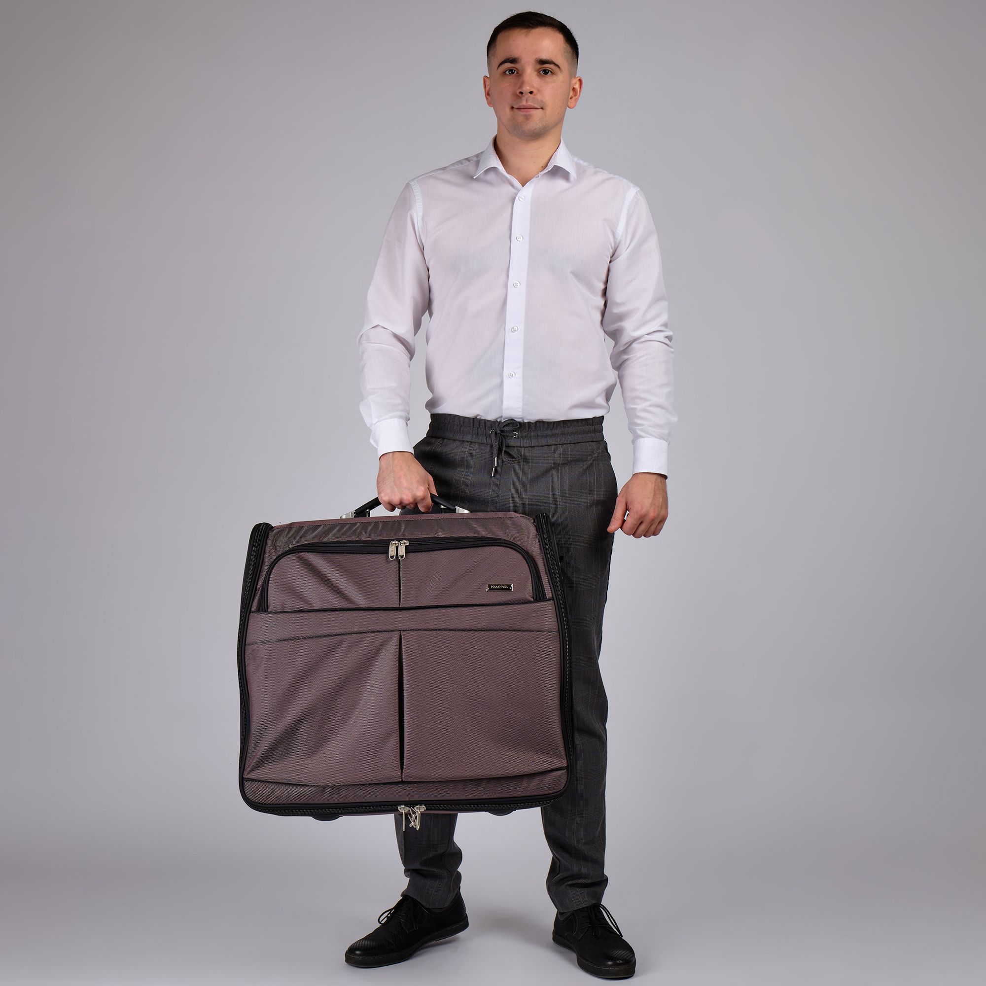 Портплед POLAR Полар – это дорожная сумка – чехол для переноски и хранения костюмов, рубашек, платья. Изготовлен из материалов премиум класса, высококачественный полиэстер, надежный прочный с водоотталкивающей пропиткой, который не выгорает, не трескается на морозе, устойчив к перепаду температур. Портплед для одежды удобен для перевозки деловых костюмов в командировке. Внутри сумки-портпледа фиксатор для одежды с креплением на 4 вешалки.  В портпледе есть отделение на липучке для рубашек, футболок с фиксирующими ремнями. Большой глубокий карман на резинке для необходимых вещей, которые нужно взять с собой (галстук, платок, шарф, папка с документами, кошелек, майка, футболка и другое).  Снаружи, на передней стенке портпледа, имеется объёмный и плоский карман на молнии для деловых бумаг и папок. Задний большой карман на молнии. Портплед для одежды мужской, женский, унисекс. Для удобства переноски есть плечевой ремень и надежная ручка для переноски. Вешалка в комплект не входит. Перед покупкой уточните у своего авиаперевозчика допустимые габариты для провоза ручной клади, чтобы определить подходит вам эта модель или нет.
