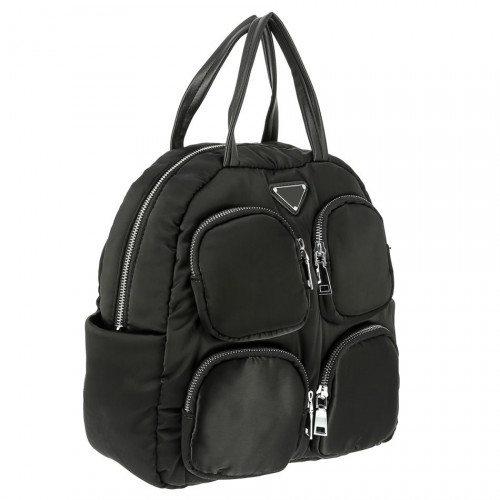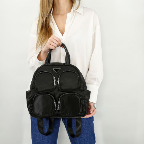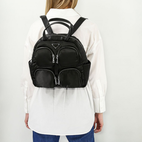 Внутри: одно большое отделение с карманами на боковых стенках: один на молнии и два открытых. С внешней стороны на лицевой стенке четыре накладных кармана на молнии. По бокам два открытых кармашка. Лямки регулируются по высоте. Сумка-рюкзак закрывается на молнию.