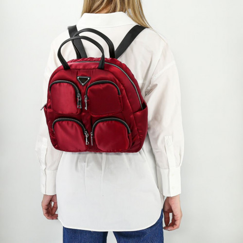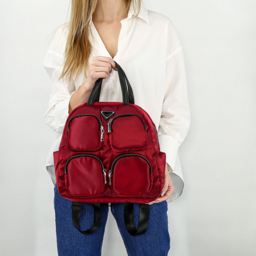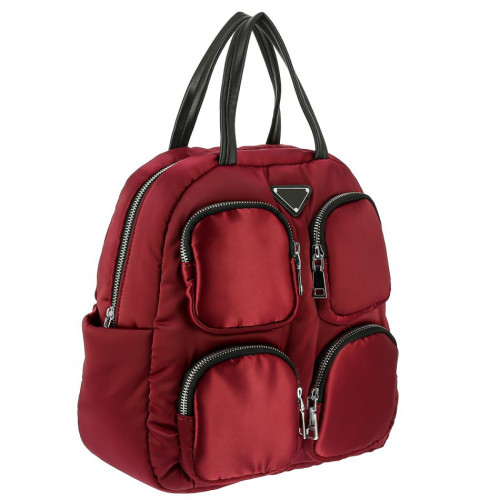 Внутри: одно большое отделение с карманами на боковых стенках: один на молнии и два открытых. С внешней стороны на лицевой стенке четыре накладных кармана на молнии. По бокам два открытых кармашка. Лямки регулируются по высоте. Сумка-рюкзак закрывается на молнию.