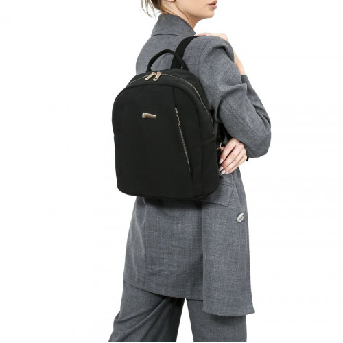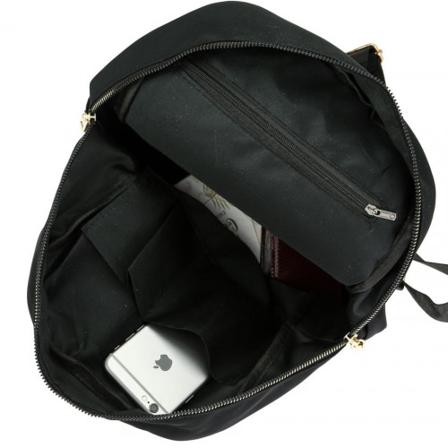 Внутри: одно большое отделение с карманами на боковых стенках: один на молнии и два открытых. С внешней стороны на задней стенке карман на молнии. На лицевой стороне два кармана на молнии. По бокам два открытых кармашка. Рюкзак закрывается на встречную молнию.