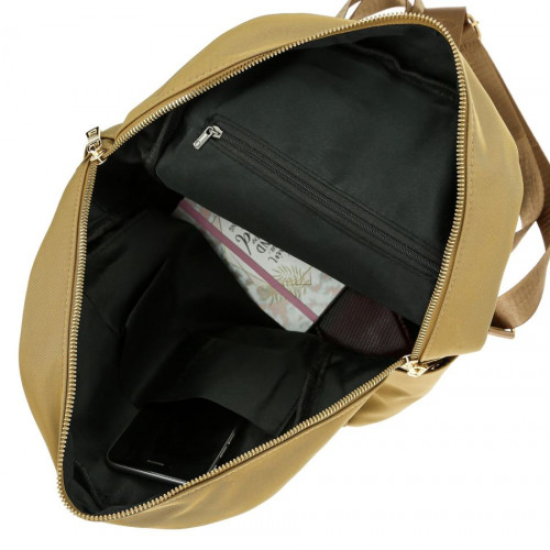 Внутри: одно большое отделение с карманами на боковых стенках: один на молнии и два открытых. С внешней стороны на задней стенке карман на молнии. На лицевой стороне два кармана на молнии. По бокам два открытых кармашка. Рюкзак закрывается на встречную молнию.
