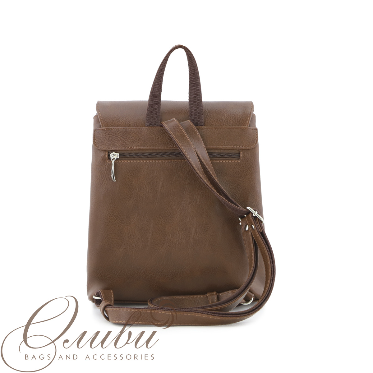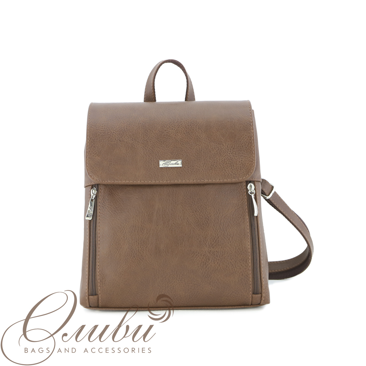 Рюкзак женский Оливи, мягкий с клапаном на регулируемых заплечных ремнях и маленькой ручкой. Два отделения на молнии. Передняя стенка: два кармана на молниях. Задняя стенка: карман на молнии. Внутри: карман на молнии.
