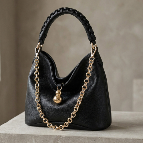 Изящная женская сумка из мягкой чёрной экокожи с выразительной фактурой. Плавная, слегка драпированная форма подчёркивает женственный силуэт модели. Плетёная ручка придаёт сумке характер и ощущение ручной работы, а декоративная цепочка в золотом оттенке добавляет аккуратный акцент и визуальный баланс.