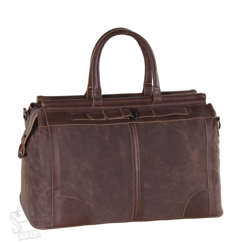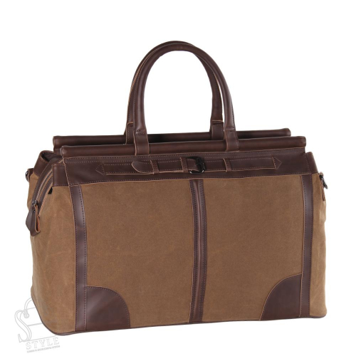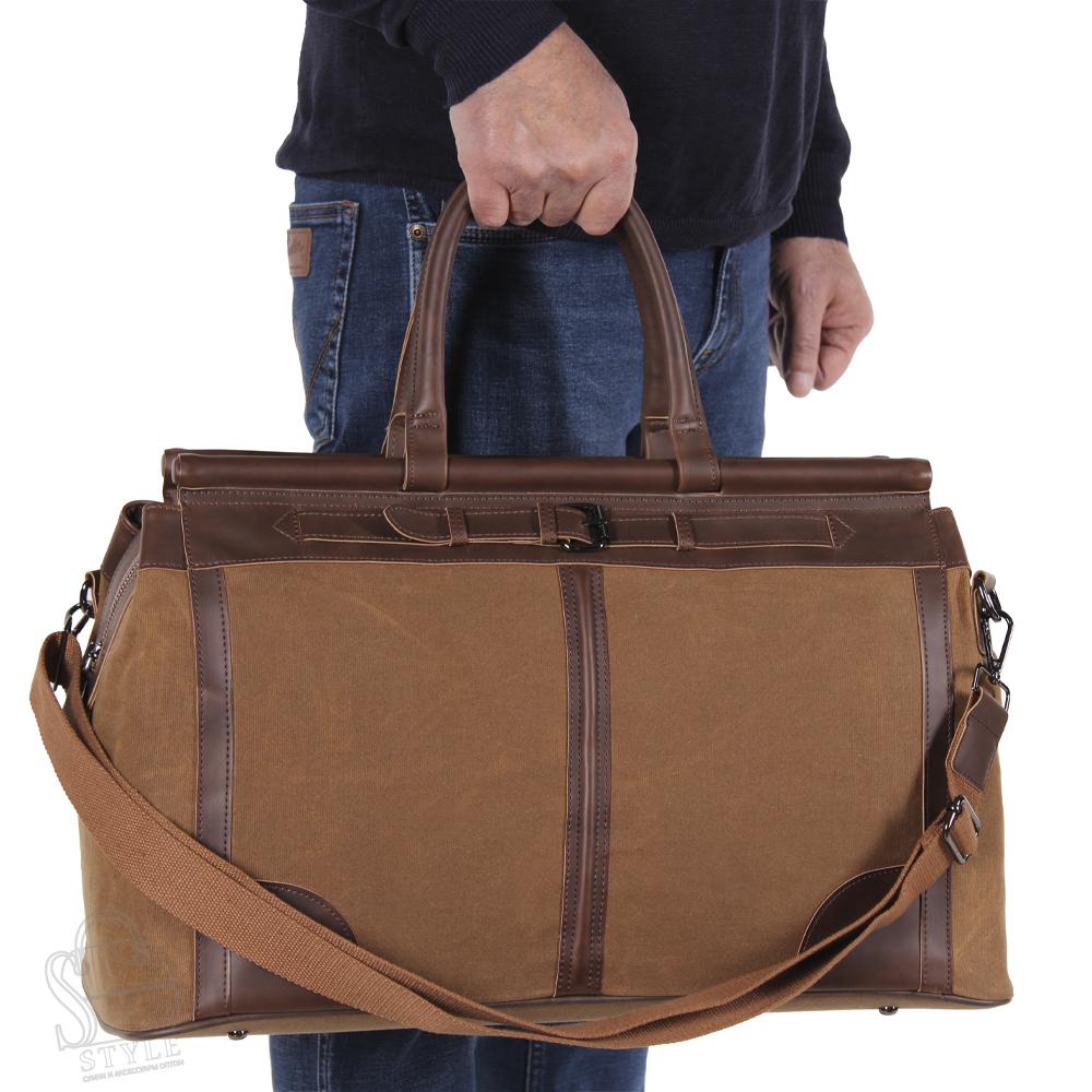 Дорожная сумка, выполнена из брезента. Дополнена темной серебристой фурнитурой. Данная модель закрывается на молнию, носится в руке или на плече с помощью ремня. В комплекте предусмотрен ремень-стропа с регулировкой длины. А так же встроенные ручки. Каркас мягкий.